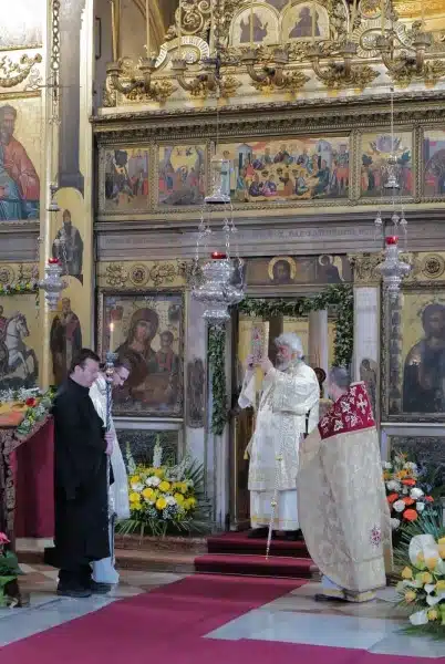 Alla Cattedrale di San Giorgio dei Greci, Centro della Sacra Arcidiocesi Ortodossa d’Italia, si è celebrata la festa patronale del Santo Megalomartire Giorgio il Trionfatore, che quest’anno coincideva con la domenica di Tommaso (Antipascha). SER il Metropolita Polycarpos ha celebrato la solenne liturgia pontificale circondato dal clero della cattedrale. Presenti alla Liturgia il Prefetto e il Questore di Venezia, nonché il Console greco a Venezia e il presidente dell Comunità greca di Venezia.
